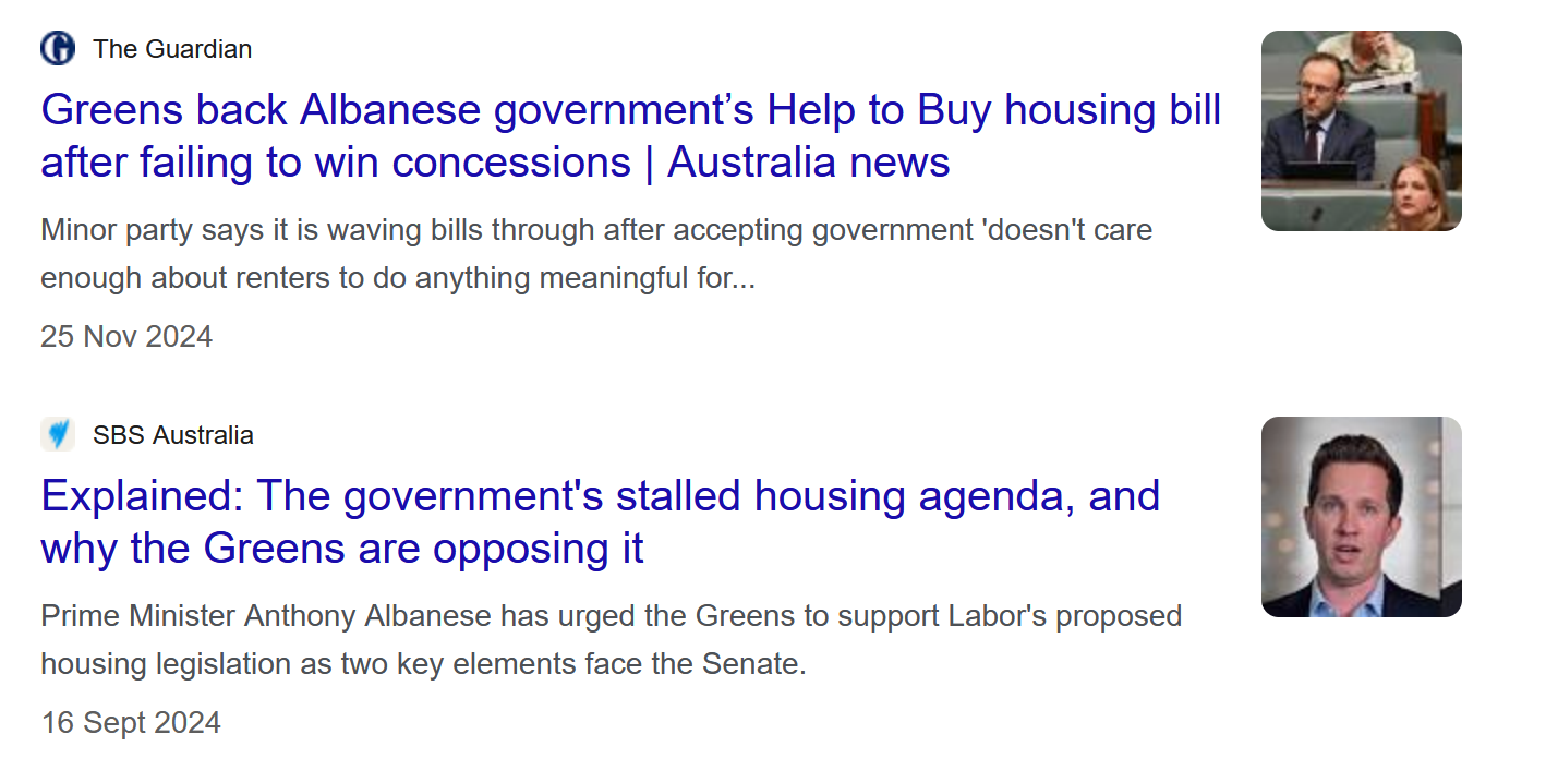 Of course, the Greens did end up voting through both bills, securing a modest $3 billion in extra funding for affordable housing in exchange for supporting the Housing Australia Future Fund bill in 2023, but securing no additional concessions in exchange for supporting Labor’s ‘Help to Buy’ and ‘Build to Rent’ bills late last year.