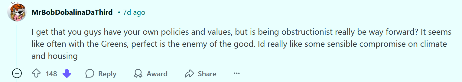 And yet, quite a few voters – particularly upper-middle-class voters in electorates that have been digitally carpet-bombed with anti-Greens propaganda – seem annoyed that the Greens are “always blocking Labor’s bills.” Apparently they feel the Greens are ‘obstructive,’ even though the party didn’t obstruct anything that was going to meaningfully address the capitalist polycrisis.