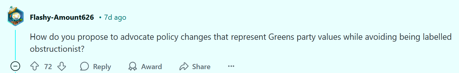 Thanks for reading! Share your thoughts in the comments below. I don't see many Greens members prompting open discussions about parliamentary strategy in public forums, so if you value writing like this, please consider supporting it by signing up for a $1/week paid subscription to my monthly newsletter.