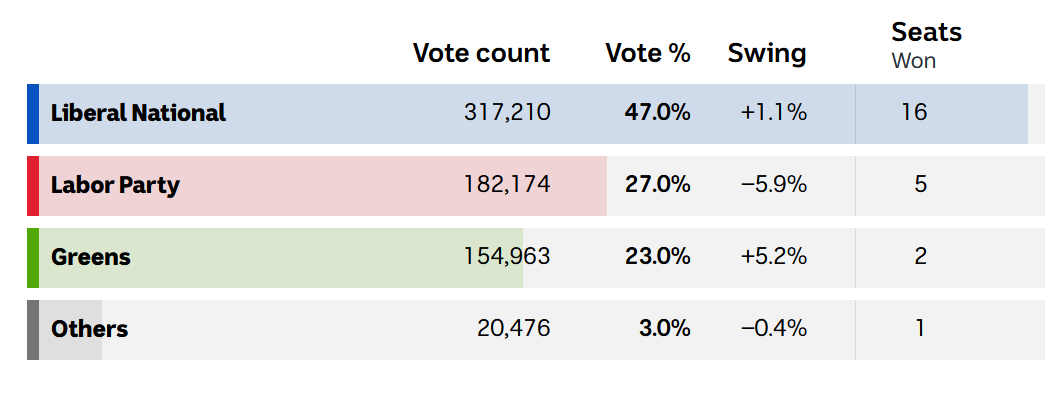 This was a particularly rough election for Labor. With a few notable exceptions, when you add it all up, Labor lost some votes to the LNP and a lot of votes to the Greens, who are now beating Labor on primary votes in 10 out of Brisbane’s 26 wards, which has significant ramifications for the state election later this year.