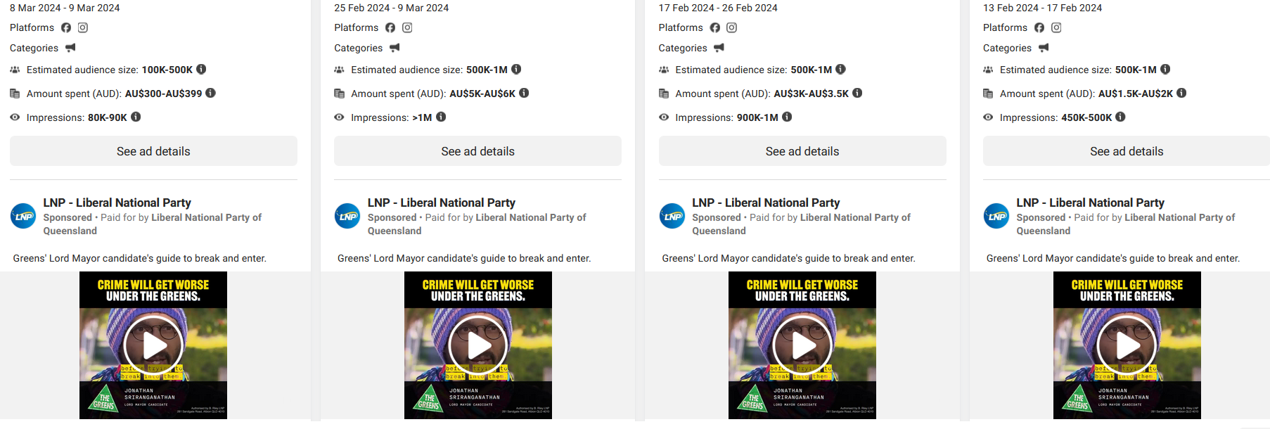 According to Meta’s public reporting, the LNP spent upwards of $12 000 just sponsoring this one short ad on Facebook alone, implying that I wanted to break into people’s homes, with the various versions of the ad clocking up a couple million impressions (actual impressions, not just ‘reach’) from Brisbane viewers. And they ran dozens of attacks ads on all major platforms, but also via digital distribution channels that feed ads to smaller niche phone apps.