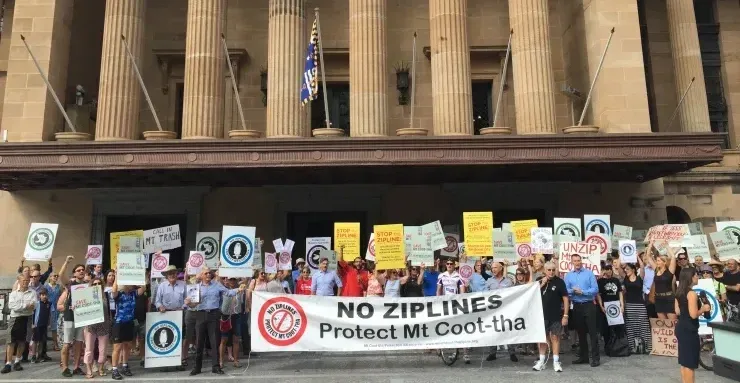 Proposals for a commercially-operated recreational zipline down Mt Coot-tha were first confirmed by LNP Mayor Graham Quirk in April 2017 (it had been floated less concretely for a couple years before that). The project would have necessitated clearing hundreds – possibly thousands – of trees, and was an environmentally destructive commercial venture within a public green space. It would likely also have opened the door to further privatisation and commercialisation of the reserve. With some solid leadership from the office of Greens MP for Maiwar, Michael Berkman, local residents joined with environmentalists from across the city to organise submission-writing campaigns, public meetings and rallies.
