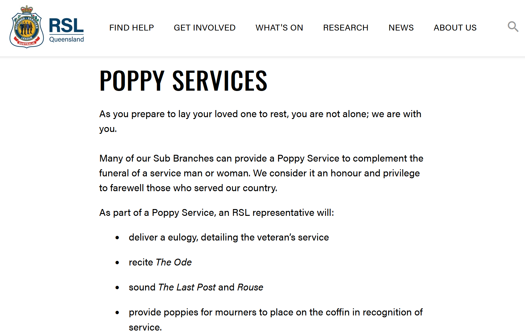 A poppy service basically feels like a condensed, 15-minute version of a Remembrance Day ceremony. RSL protocols dictate that it can happen at the graveside just before burial or, as in my uncle’s case, shoehorned into the church funeral itself. The ceremony includes recitation of the Ode of Remembrance, and playing of the Last Post and The Rouse (not to be confused with Reveille).