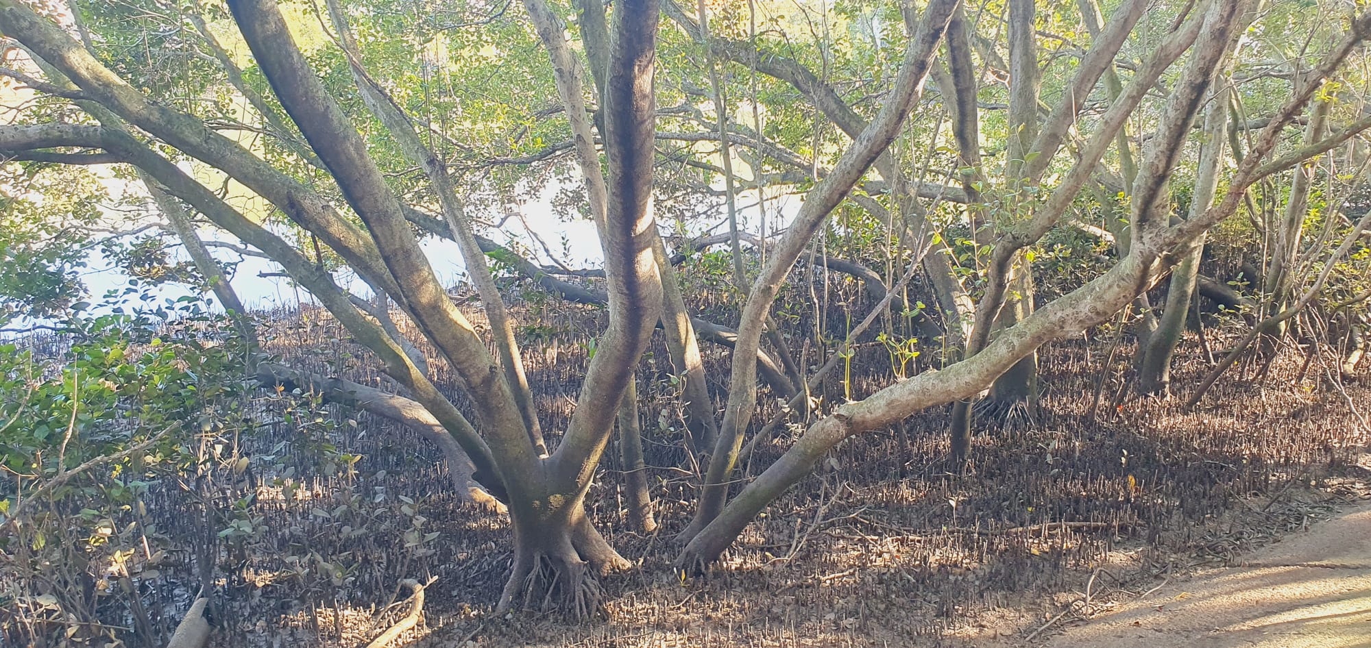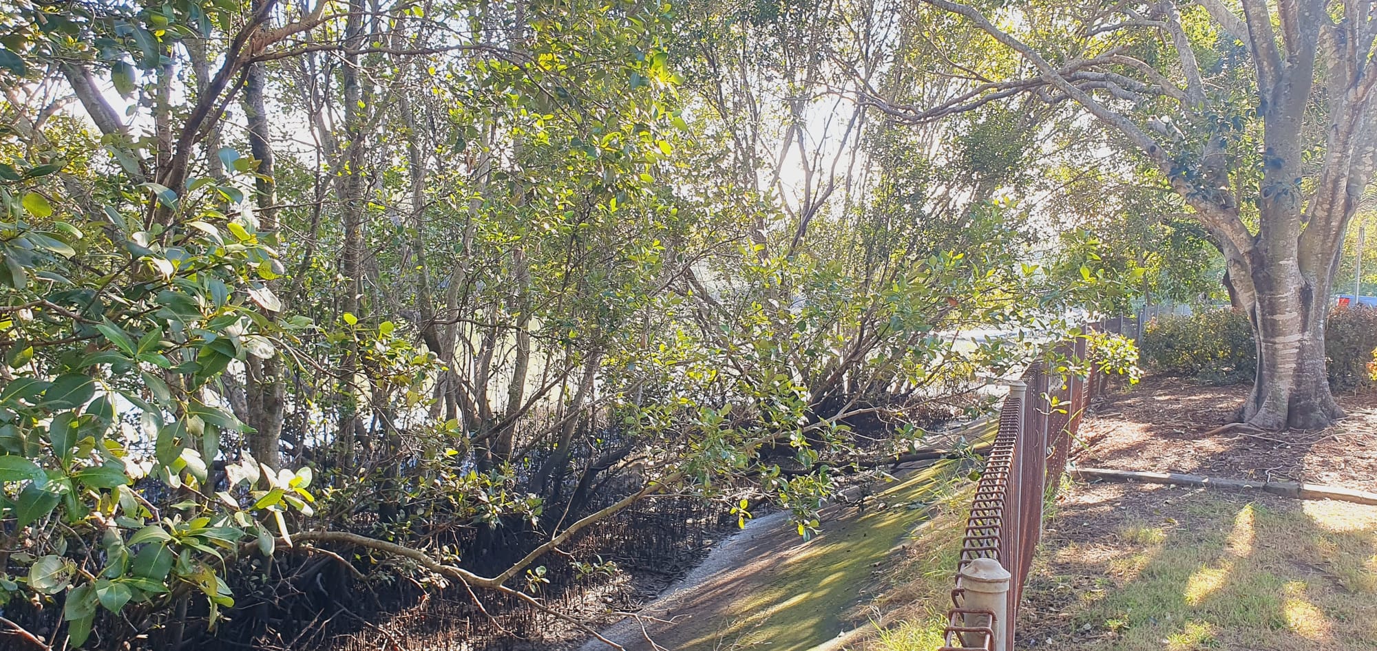 The mangrove veil softens the glare of sunlight bouncing off the creek’s surface.