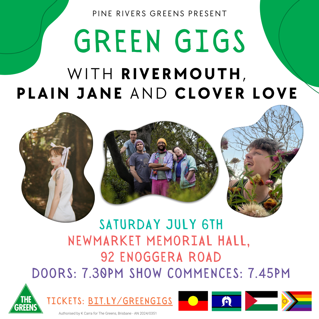 My band Rivermouth is playing a fundraiser gig for the Pine Rivers Greens at the Newmarket Memorial Hall, supported by Plain Jane and Clover Love. The line-up showcases various genres including hip-hop, folk and punk.
