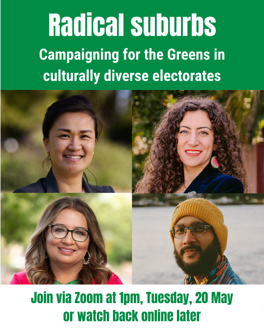 I'm really looking forward to chatting with these two amazing women about their campaigns. Excitingly, it looks like Senator Mehreen Faruqi will also be able to join us for this important discussion, to add her reflections on the experiences in western Sydney.