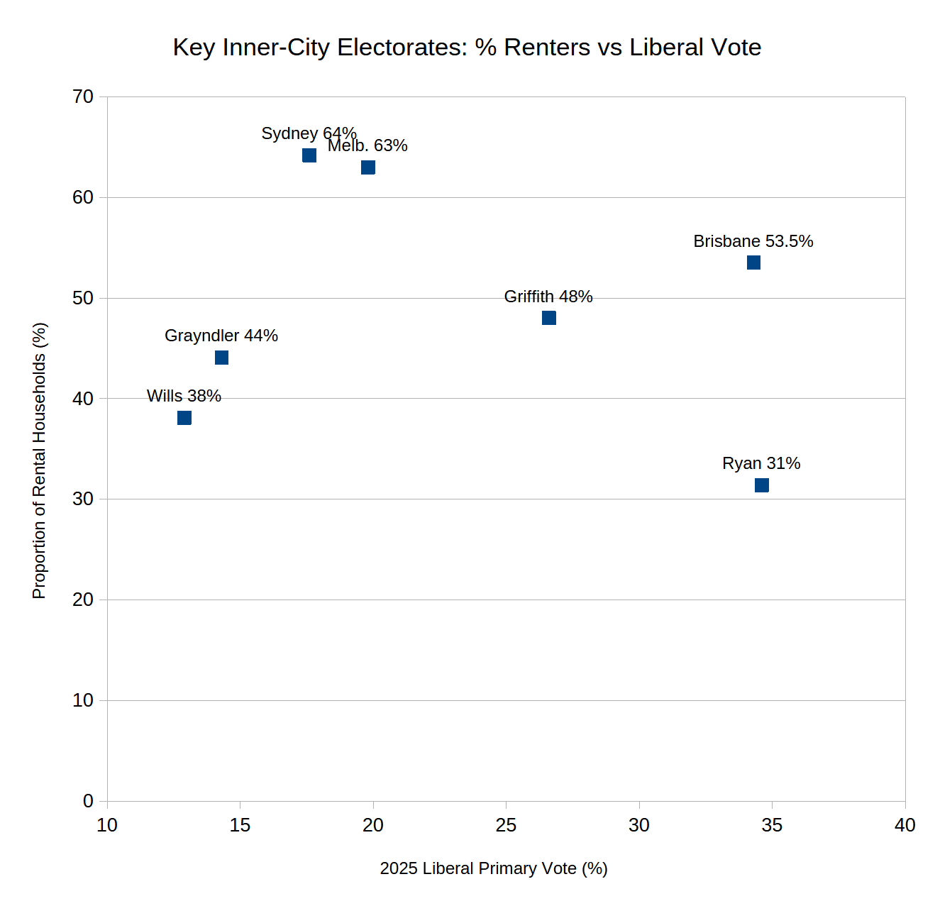 Take a look at this graph, which shows the proportion of rental households in key east-coast inner-city electorates, compared to the Liberal primary vote in the 2025 election.