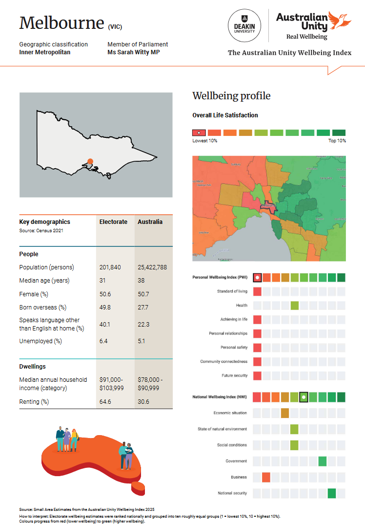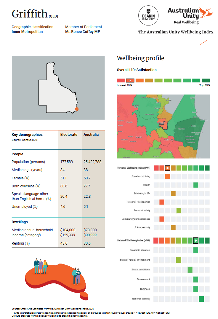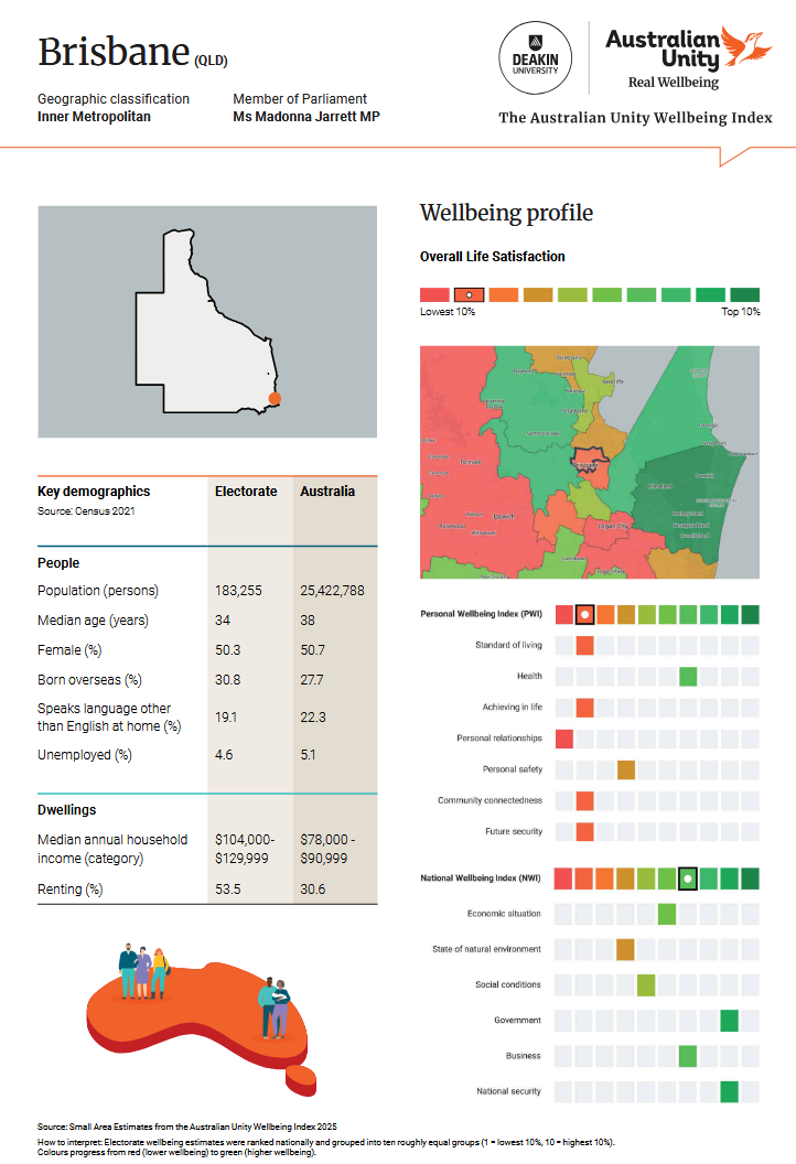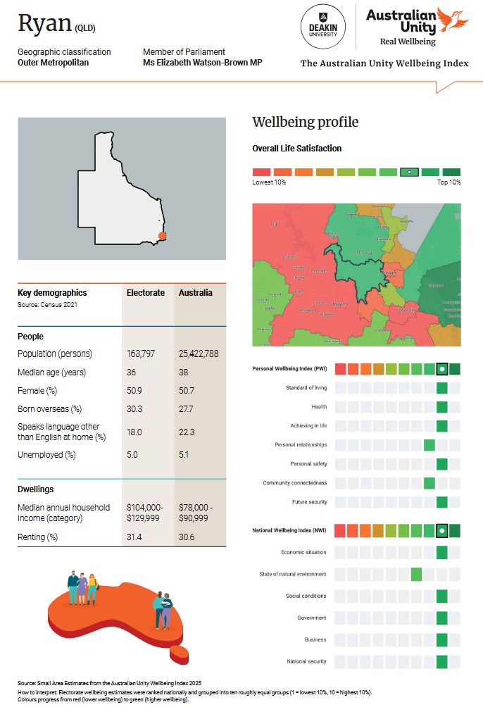 The Australian Unity Wellbeing Index explores people's own perceptions of their standard of living, health, future security etc. in each federal electorate. Whereas Ryan voters rank very high in overall life satisfaction and in the report's 'Personal Wellbeing Index,' voters in Griffith, Brisbane, Melbourne, Wills, Fraser and indeed many of the Greens' strongest federal seats, rank far lower.