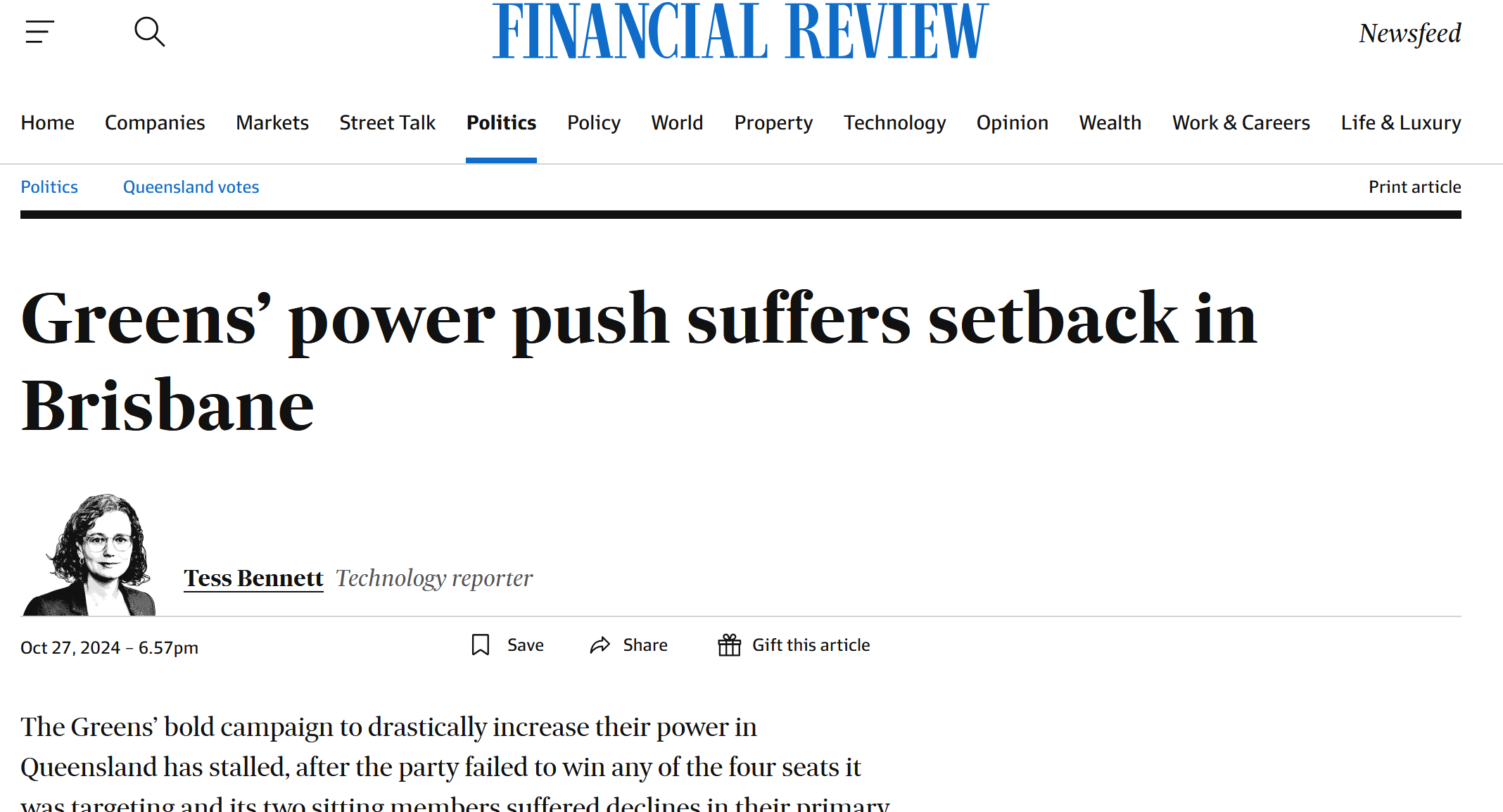 Australian Greens leadership – particularly politicians and senior staffers in other states – apparently didn’t make time to properly understand the South Brisbane loss. Instead, it seems to have been misinterpreted as evidence that the general approach taken by Max Chandler-Mather was electorally damaging (this is despite the fact that earlier in the same year, we achieved a record-high primary vote in Brisbane's council election when I ran for mayor).