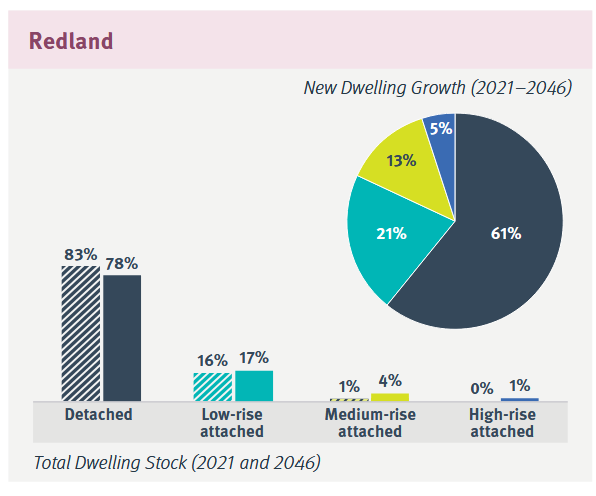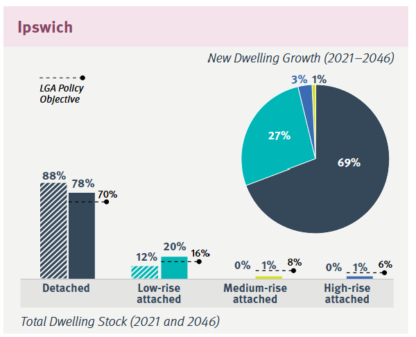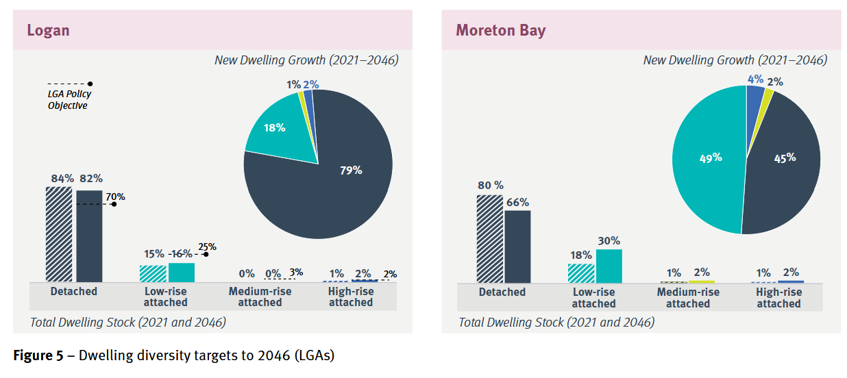 The Shaping SEQ Regional Plan 2023 does call for a modest shift in dwelling diversity, with higher rates of medium-density and high-density development (particularly within the Brisbane City Council LGA), but overall, the plan anticipates that there will be even more low-density suburban sprawl housing in 2046 than there is today