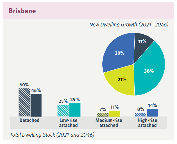 But key planning documents – such as the State Government's latest regional plan, ShapingSEQ 2023 – don't propose a substantially different trajectory for existing low-density suburbs, and in fact still support more low-density suburban sprawl development going forward. The regional plan anticipates that even by 2046, for the five local government areas within Greater Brisbane, the vast majority of dwellings will remain low-density detached homes.
