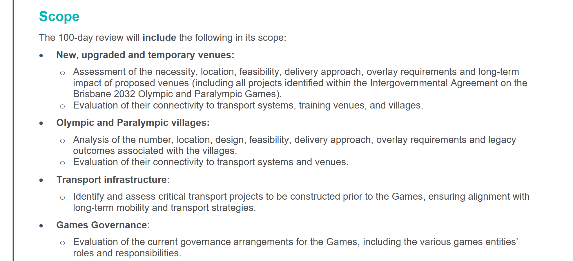 Conveniently for those advocating high spending on stadiums, the review terms of reference effectively treat the previous federal-state funding agreement between Scott Morrison and Annastacia Palaszczuk as a de facto venues budget (an 'agreed funding envelope') of $7.1 billion. So it's baking in an assumption that a whopping $7.1 billion will be spent on venues alone, contrary to previous assertions that hosting the Olympics would require minimal new venue infrastructure.