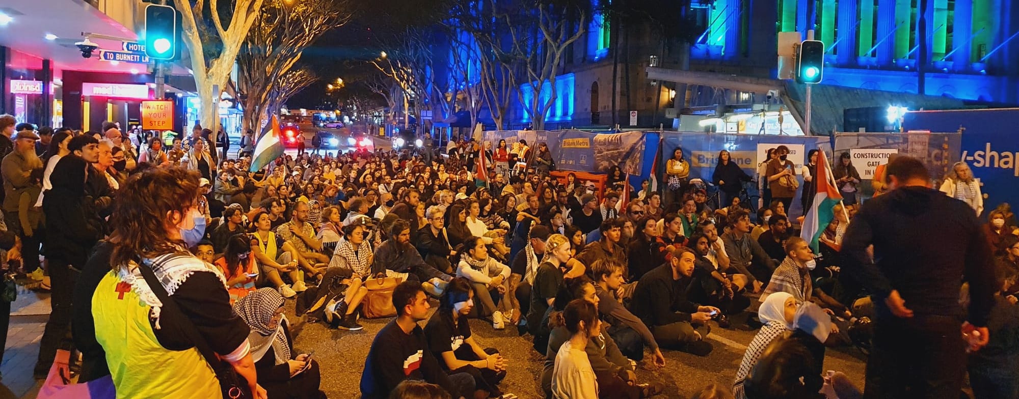 This snap sit-in tactic has been used a couple times over the years, including at an Invasion Day march when police tried to detain a young Murri participant and at least three thousand people sat down on Grey Street until the kid had been released. On that occasion (if I’m remembering correctly) the collective pressure was so strong that police decided not to arrest or press charges.