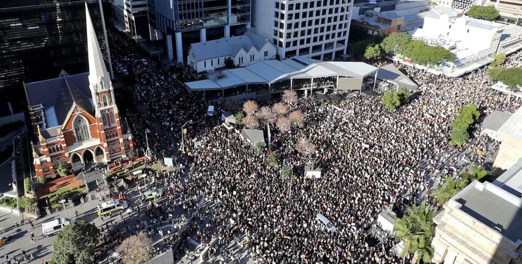 Brisbane’s Black Lives Matter rally on Saturday, 6 June 2020, was probably the largest protest the city has hosted since the anti-Iraq war campaign of the early 2000s. Over thirty thousand people violated the state government’s covid-19 health regulations against public gatherings (these health directives were – by this point – illogical and inconsistent; the government was permitting thousands of people to gather in footy stadiums and casinos while simultaneously suppressing peaceful protests).